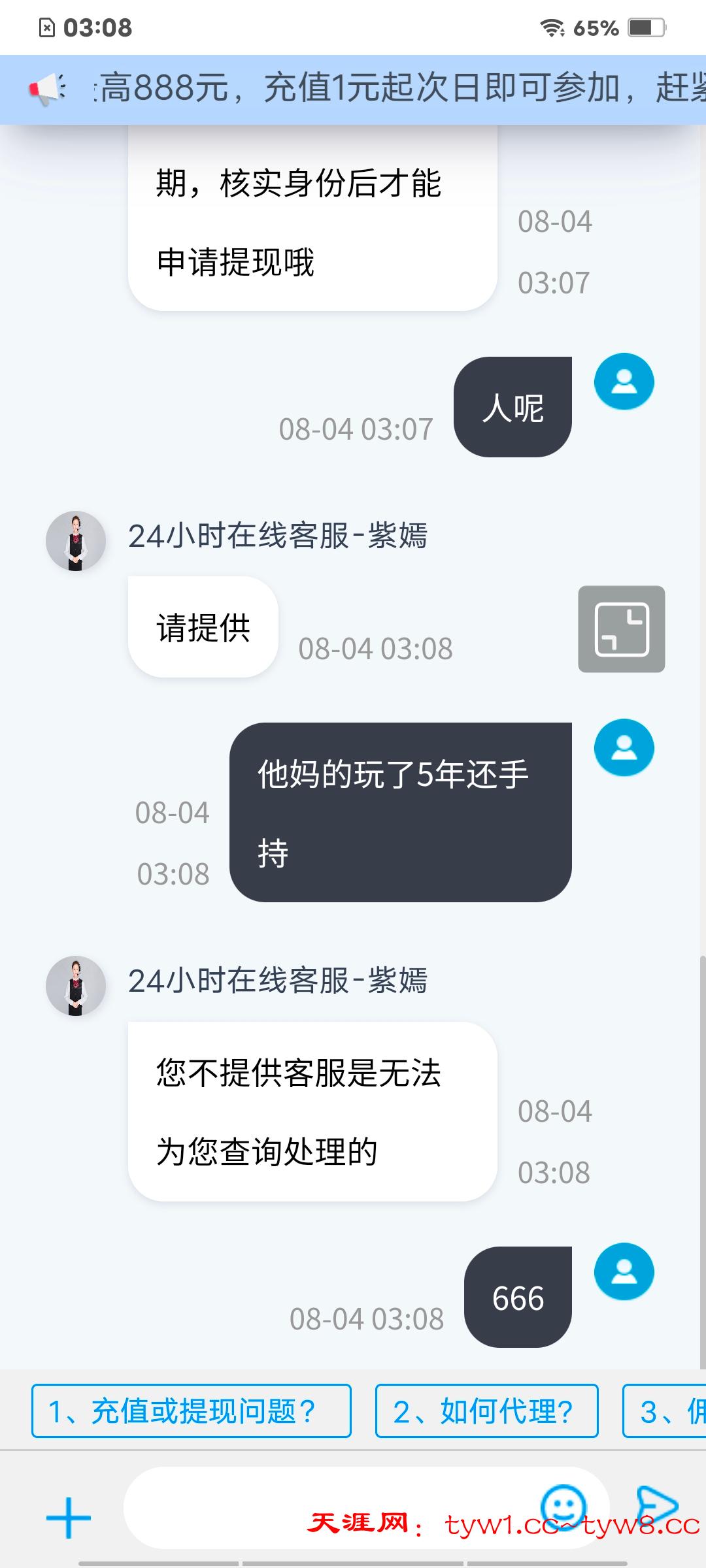之前555棋牌玩了5年的台子,输了两万,今天提现103要手持了,大家避坑,太6了,玩了5年了,尽然给我黑了,没想到的事。