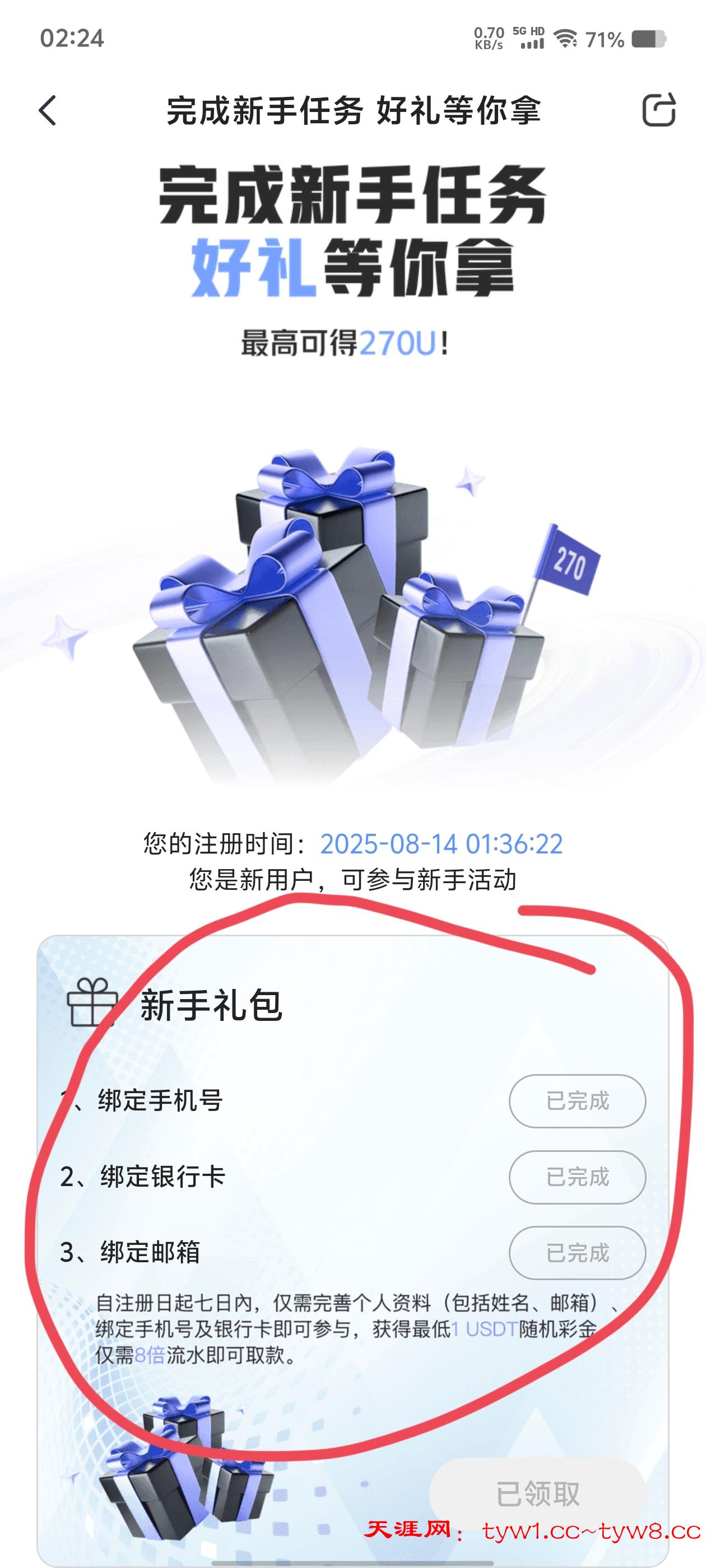 完成新手任务可以奖励,完成绑定手机号获得1u,完成绑定银行卡获得1u,完成绑定邮箱随机抽1u-270u