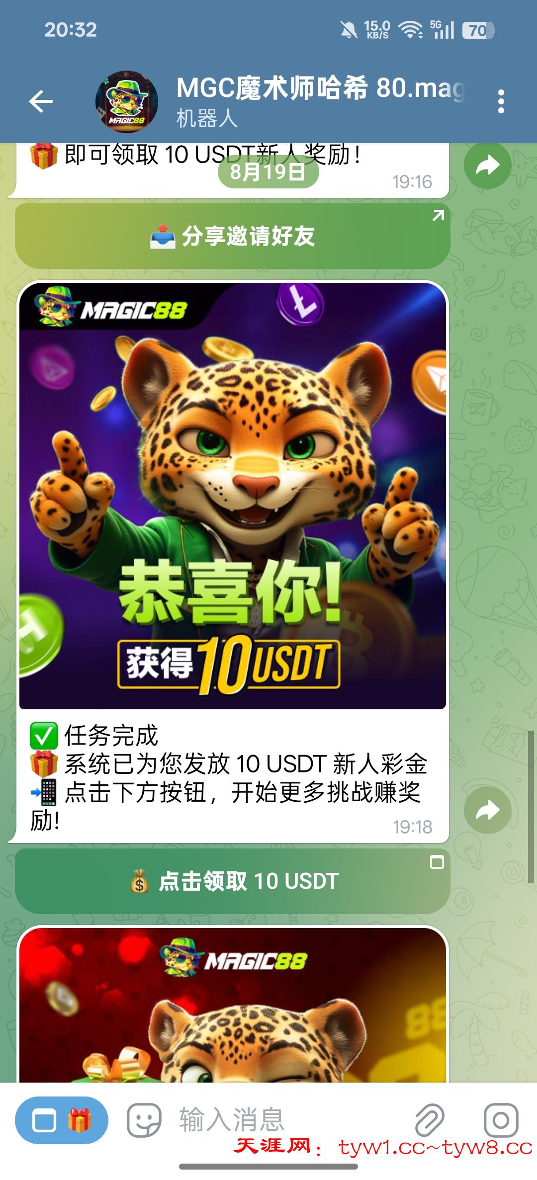 拉自己小号关注机器人加入群组就可以领取10u,没到联系客服叫她添加就行,彩金最多提10u