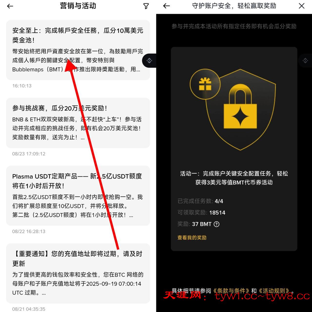 币安简单设置一下账户,领37BMT(价值2.5u)路径,首页左上角消息,营销活动