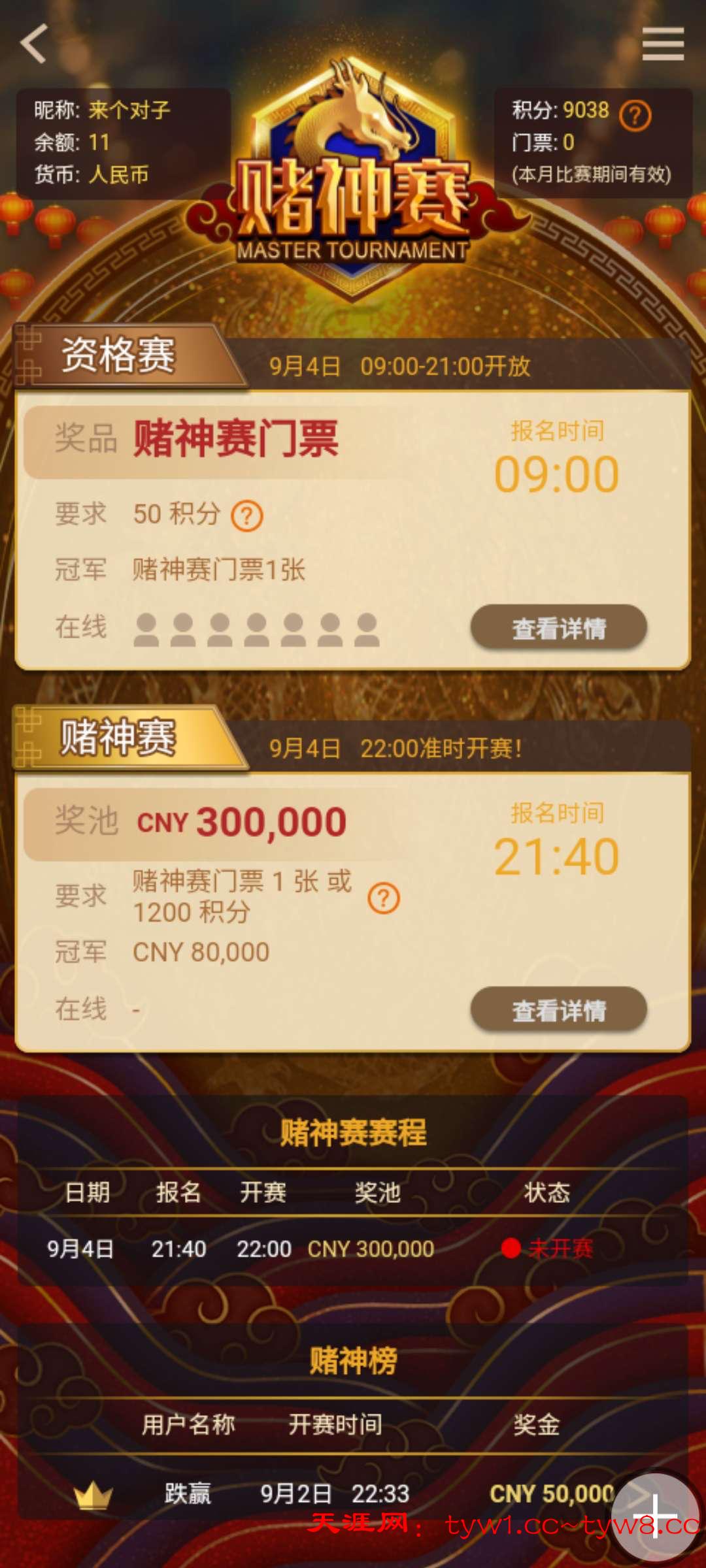 平均2天左右会有一场赌神赛,经常玩过的平台可以查看自己有多少积分,1200积分可以直接买门票直接参赛,4号晚上9点40有一场,0撸白嫖