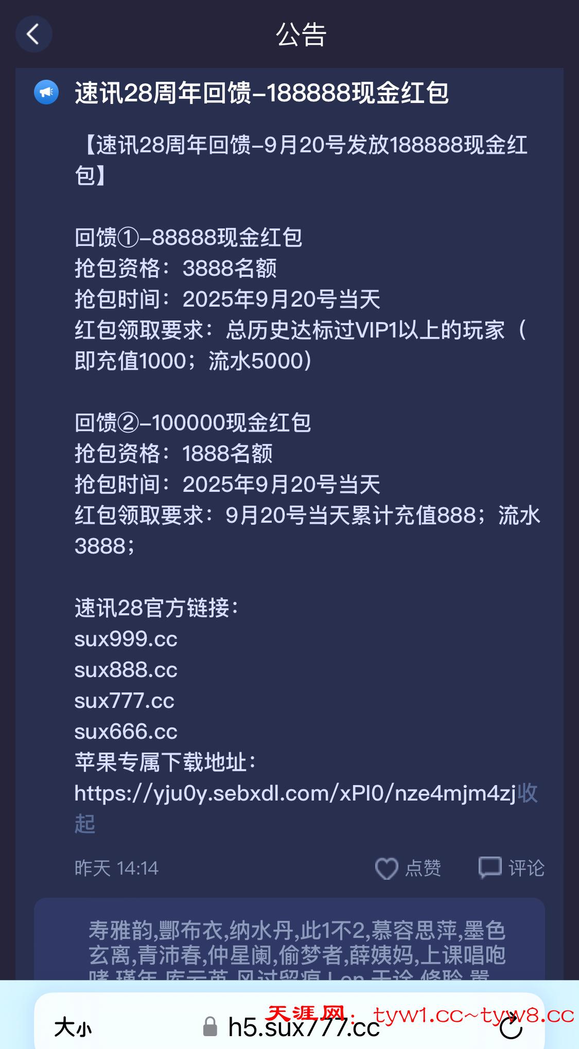 速讯28等级vip1以上的,可以领取一个红包,名额有限,速度去。看清楚要求再去 网址 sux777.cc