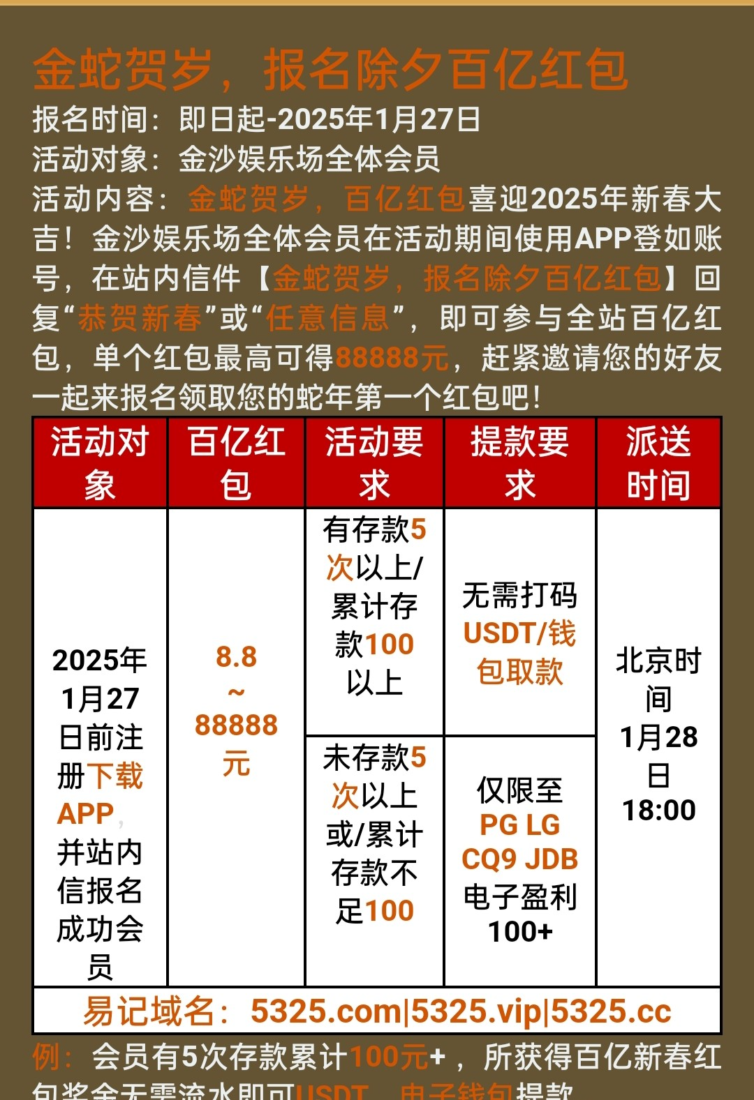 网址www.5325.com1月27日前注册新用户注册绑卡,完善信息发送站内信报名28号派送28彩金