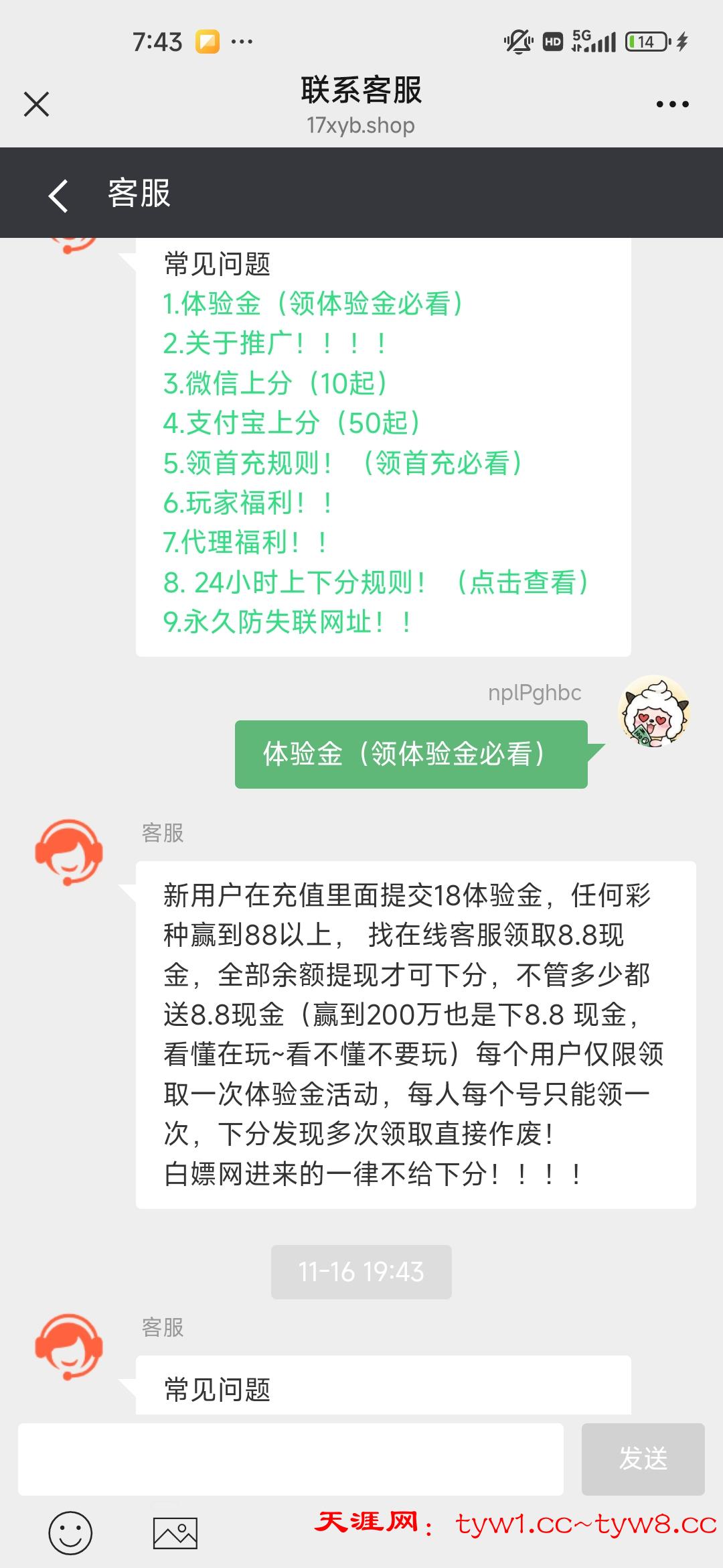 新用户在充值里面提交18体验金,任何彩种赢到88以上, 找在线客服领取8.8现金,全部余额提现才可下分,不管多少都送8.8现金(赢到200万也是下8.8 现金,看懂在玩~看不懂不要玩)每个用户仅限领取一次体验金活动,每人每个号只能领一次,下分发现多次领取直接作废!