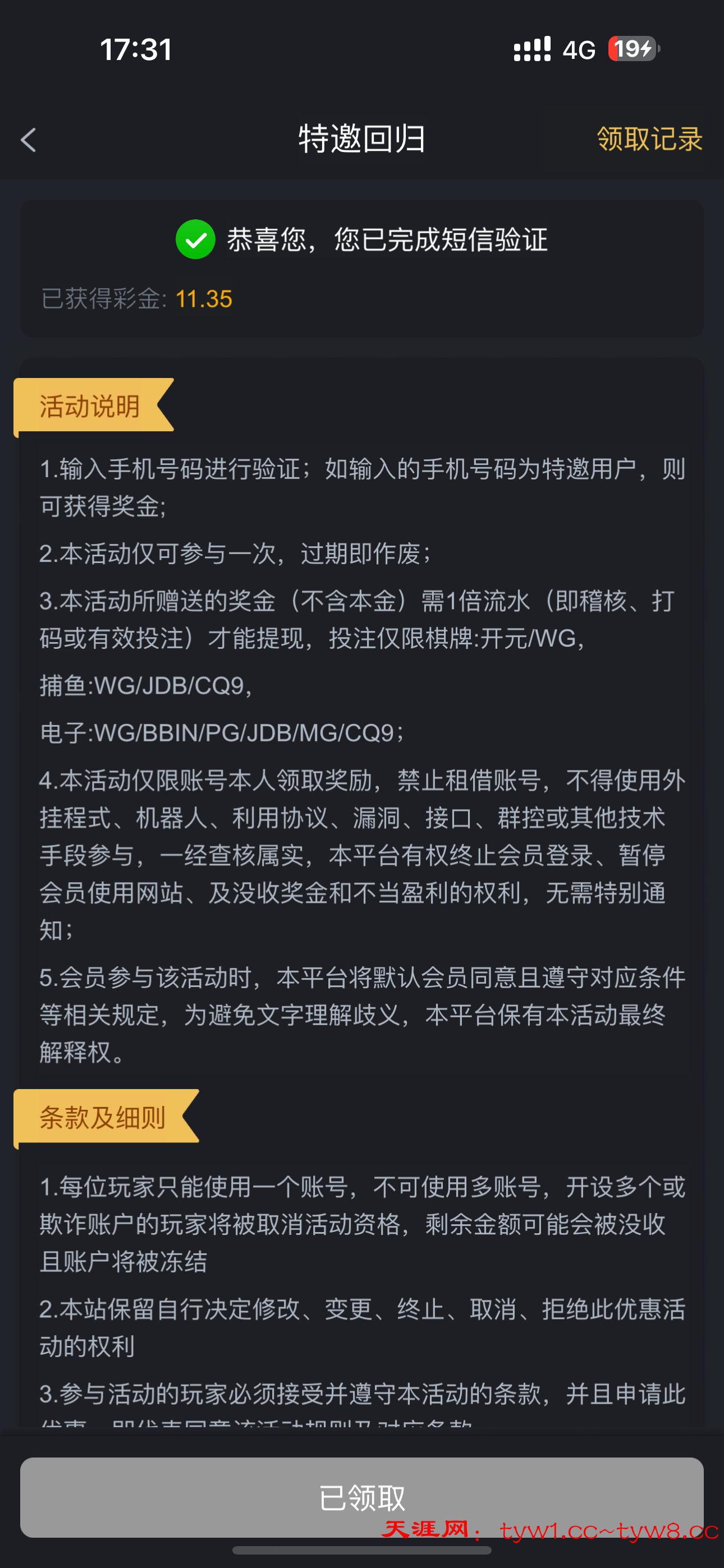 一共是两个彩金 我之前过然后可以领取那个福袋彩金,充值过几块钱就可以领取了,特邀回归是直接有活动通道领取的