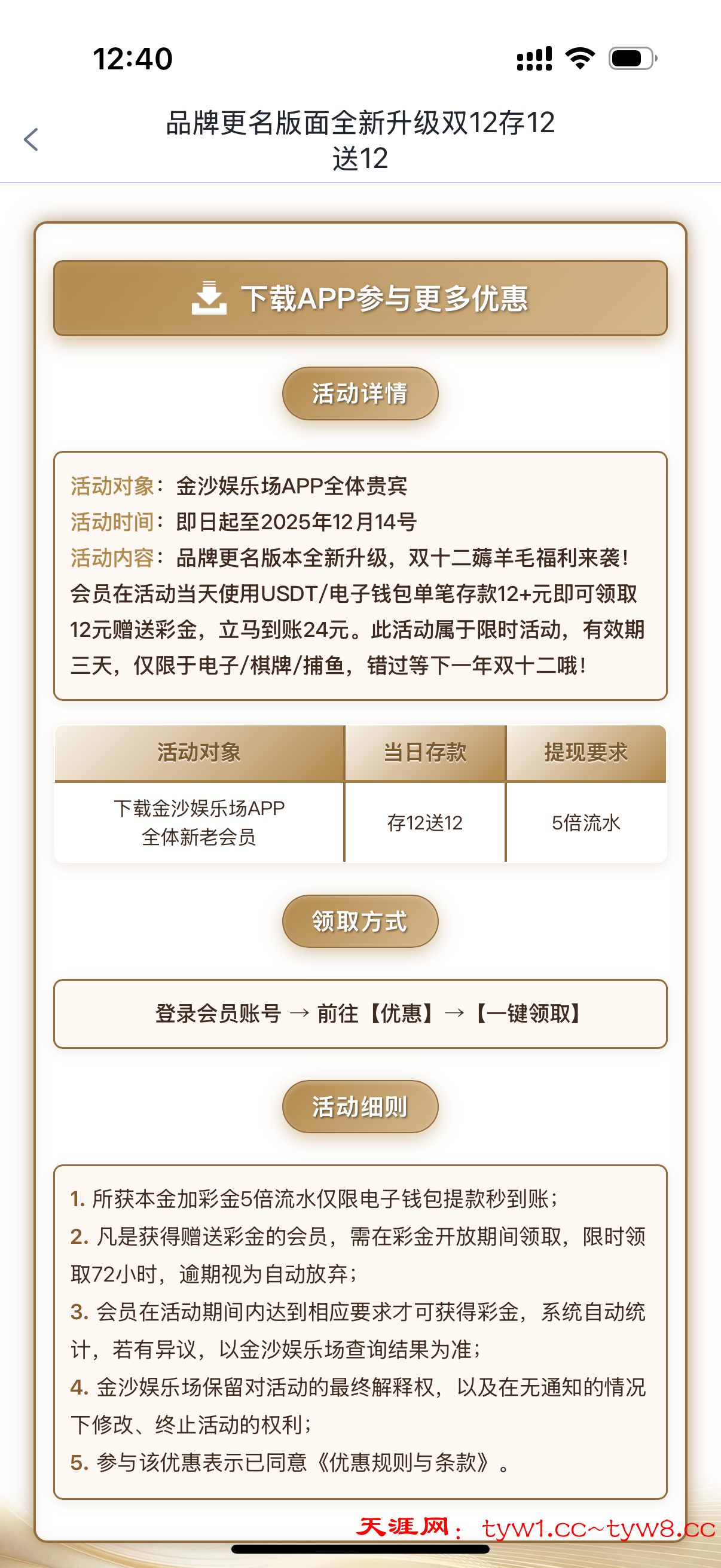 会员在活动当天使用USDT/电子钱包单笔存款12+元即可领取12元赠送彩金,立马到账24元。此活动属于限时活动,有效期三天,仅限于电子/棋牌/捕鱼