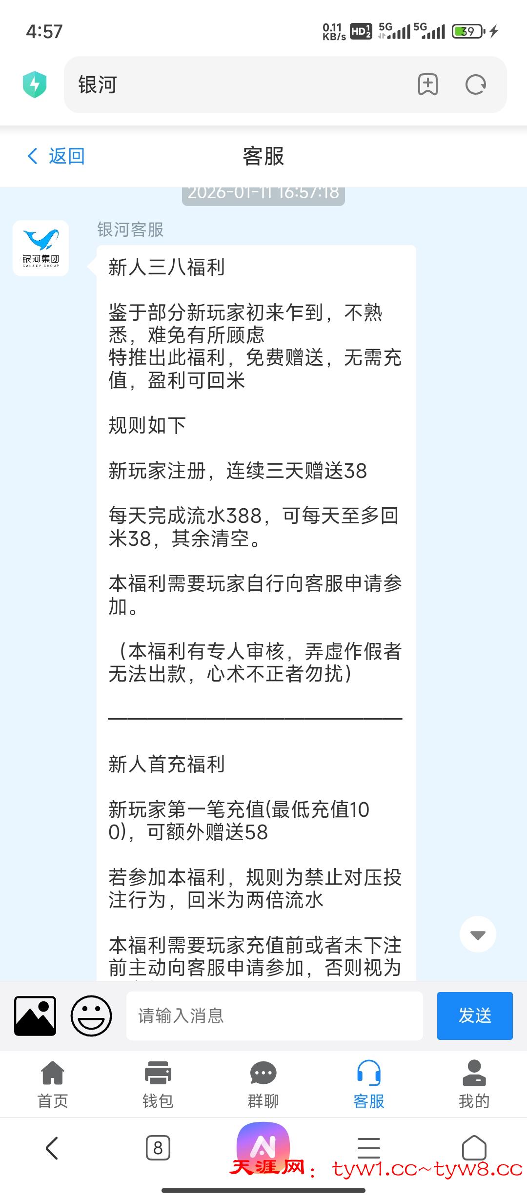注册绑定好提现方式联系客服发送新人注册38彩金,不查ip手机号多的可以一直嫖,连续领3天,388流水下38,有人亲测到账,我没打出来,禁止充值,白嫖即可