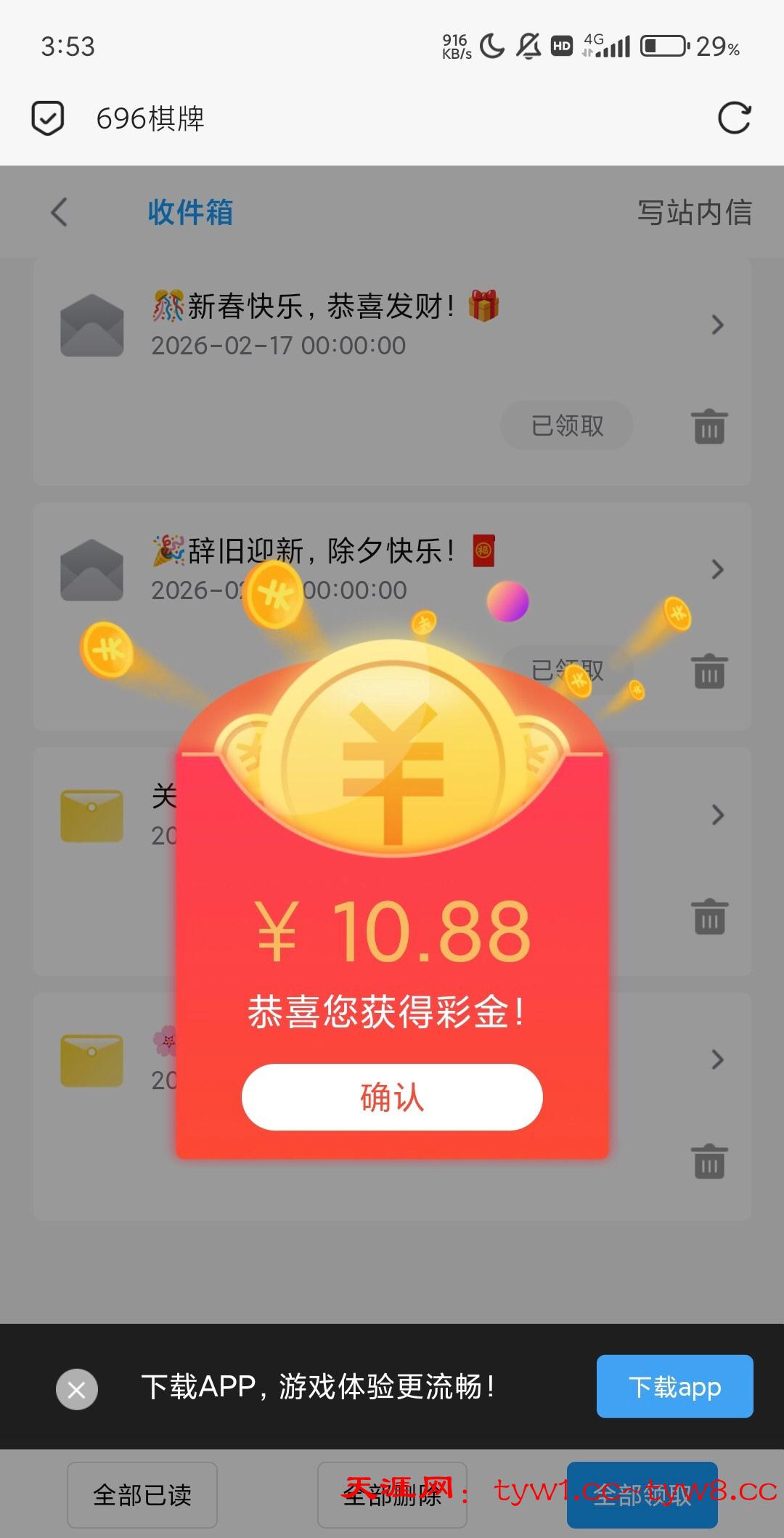 网址696.tc 今天5波红包,在邮件领取,24小时过期,记得领取