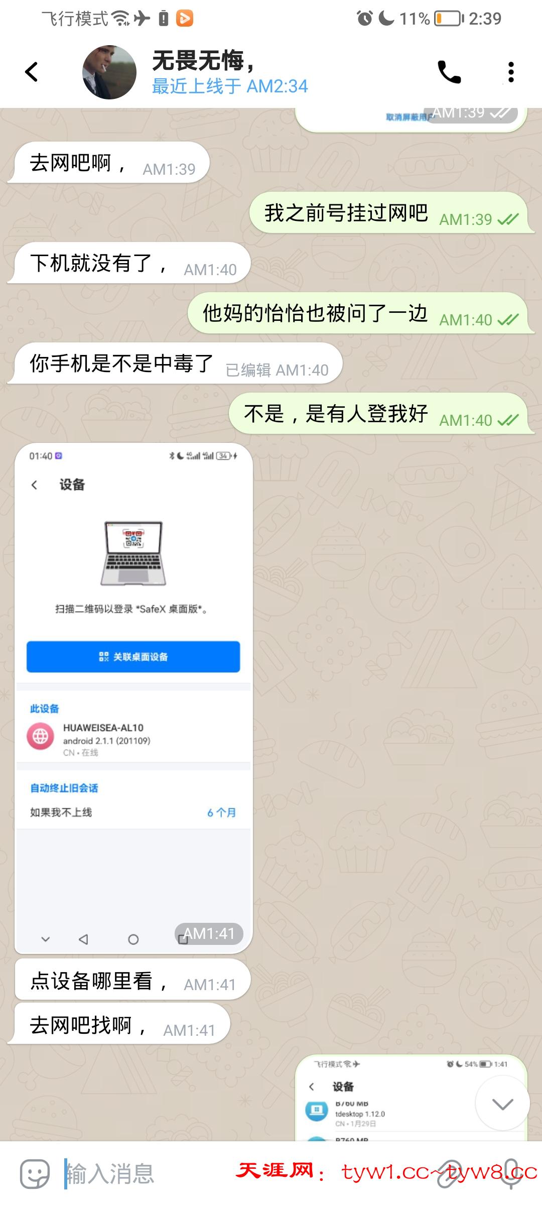 本人小飞机今天凌晨1.32被一台台湾ip电脑异地登录,上来就找了我联系人中的几个老哥借500u(包括怡怡),我是过了十几分钟上来才看到不对劲,有联系人莫名其妙发一些语言给我(电脑sw给联系人发的消息不会在手机上显示,但是手机可以收到对方回复的消息),我才知道我号出问题,然后我就手机即可联系在跟我聊天的老哥说不是本人,骗子看我上线了马上删除消息,还屏蔽联系人。我之前去网吧都会用电脑sw登陆,不知道是不是这个原因,但是有一点我搞不懂,我自己网吧登陆每次都需要手机sw对着扫码才能登上,不知道这个诈骗犯怎么登上的。
