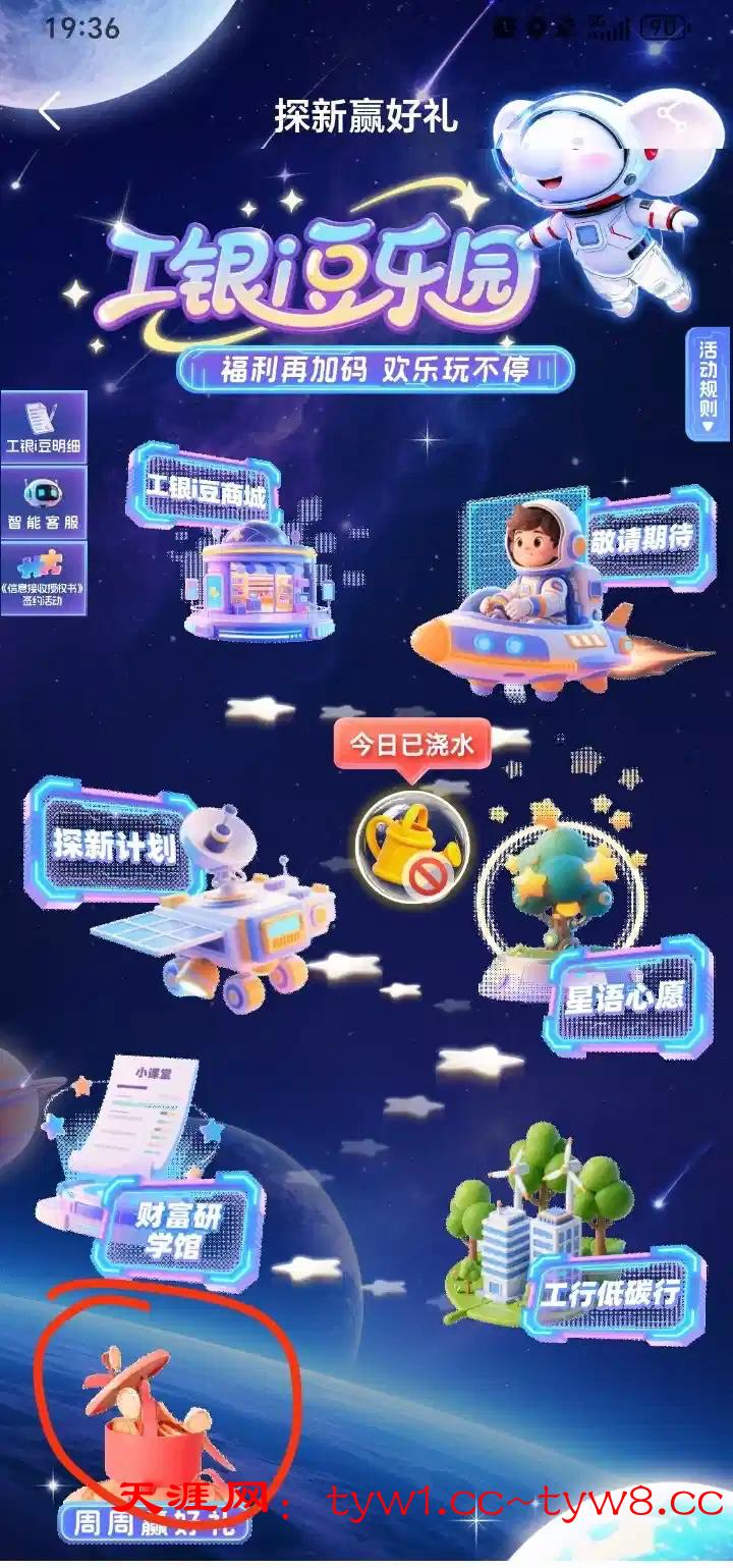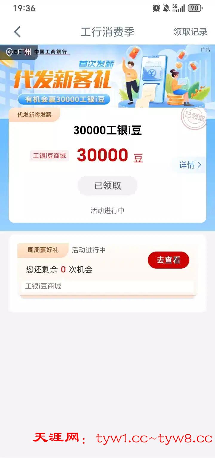 工行app里面的i豆乐园,点周周赢好礼,可以领3万豆,上面显示代发新客领取,但我也没有工行的代发工资的也可以领,没有的话勿喷,3万豆至少领20微信代金券(微信工行微金融兑换)