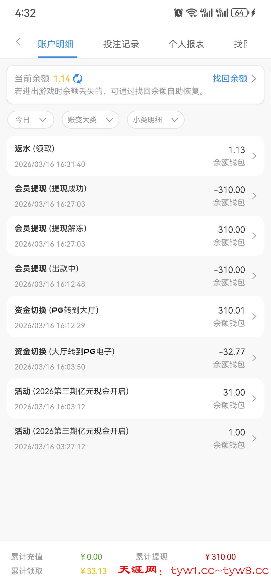 昨天领了31没打起来,结果今天领了3块升级彩金加4毛流水,打到124去提说要活动彩金要10倍流水,310提,然后打到510,提了310,多的200收回了,不领取那4毛流水是不是就能提510了,好在得吃310,