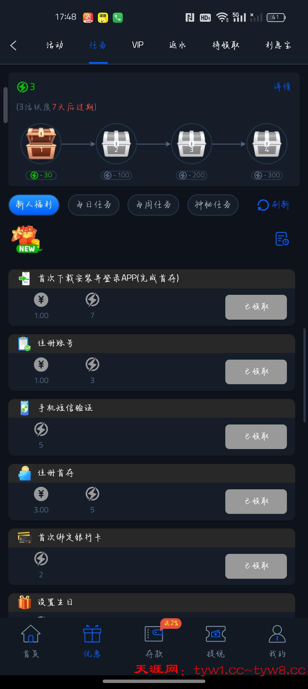 最低充值20完成所有任务可以领取10(最低100提)