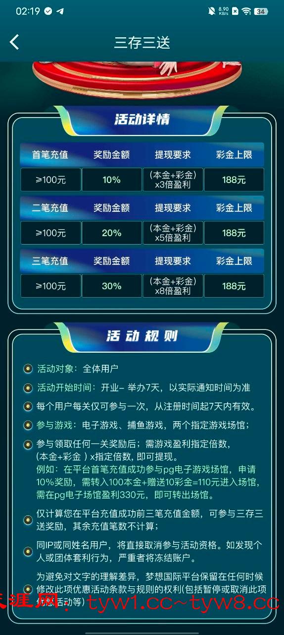 【梦想国际】前100代充8元 存送10% 返现300