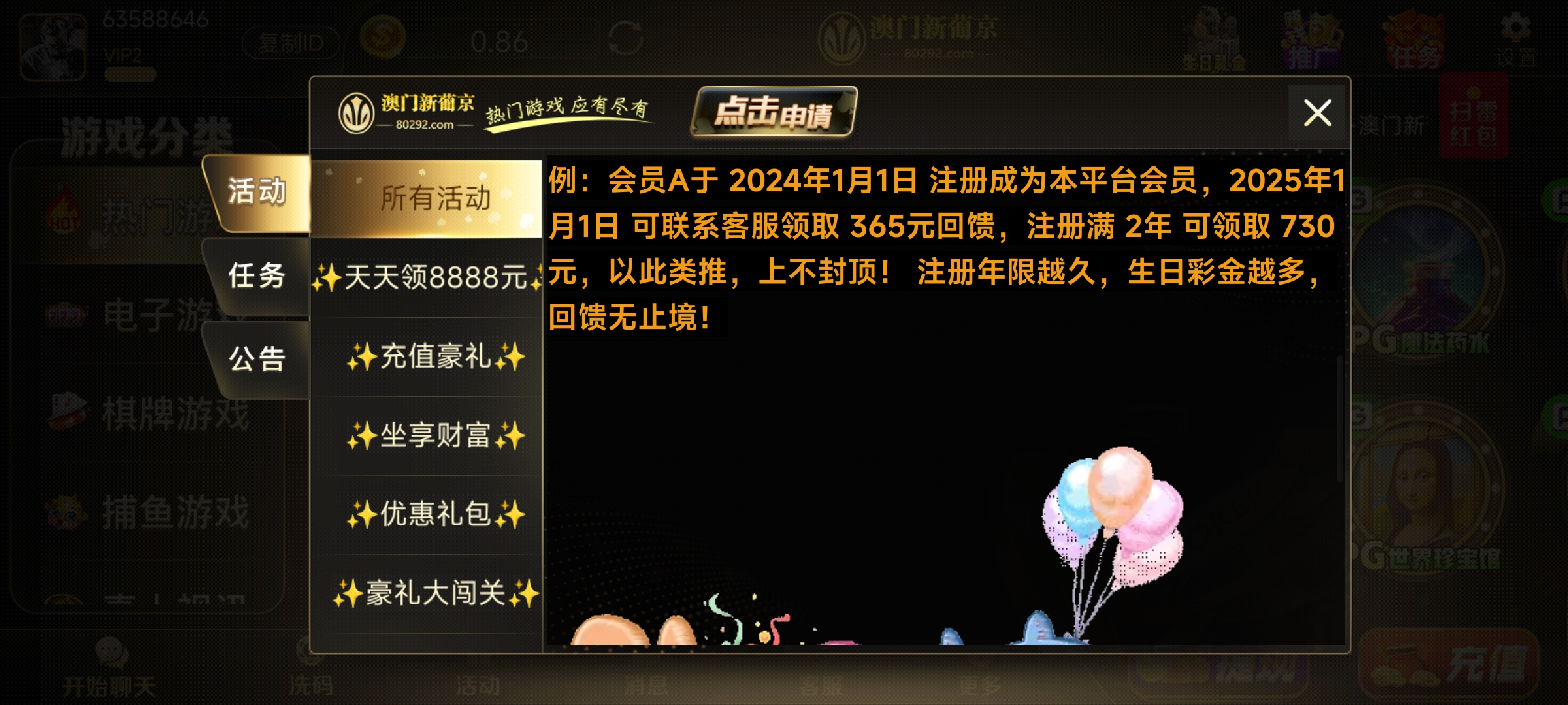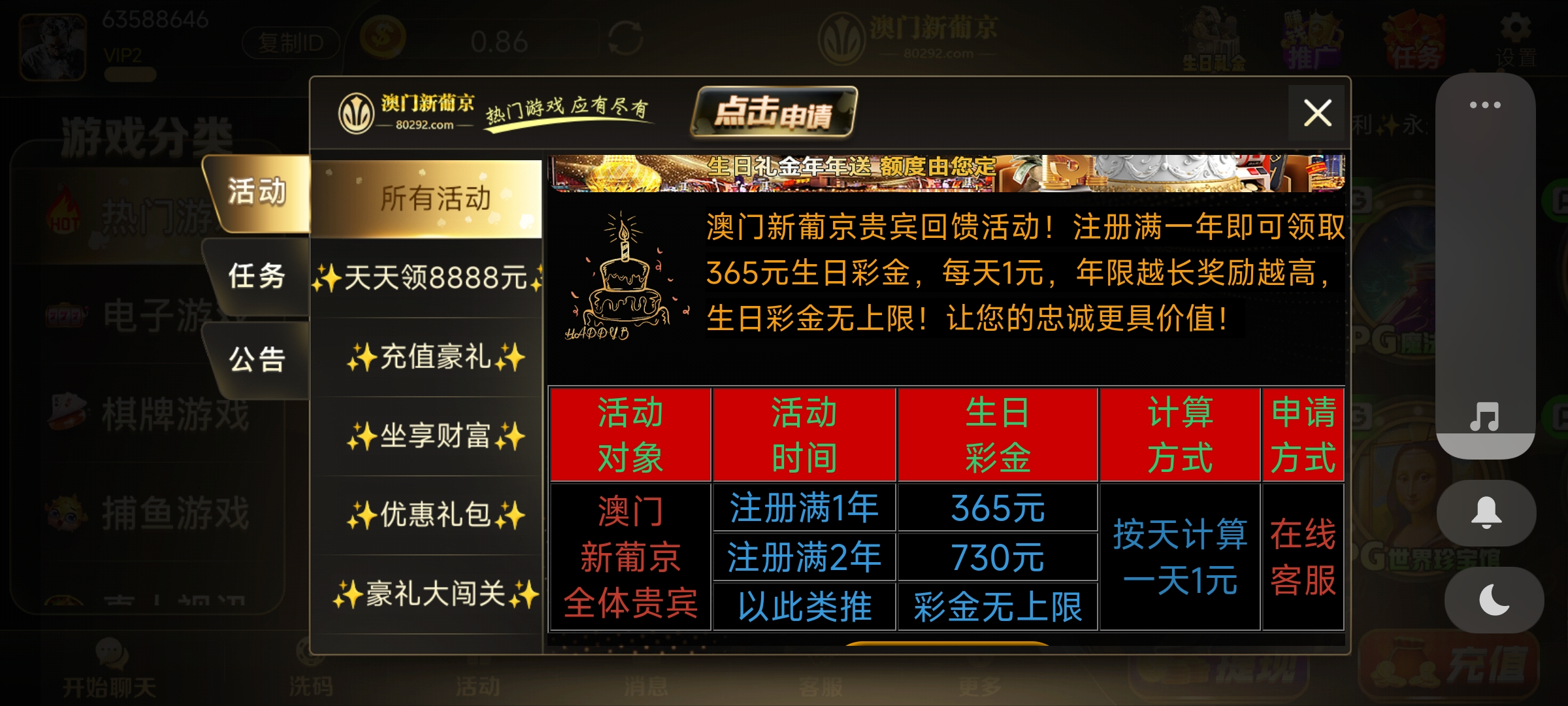 之前注册过这个新葡京的老哥可以去申请一下生日礼金365,我去年注册了两个号,还有三个月我就可以领365 ,之前注册过的老公可以去看看