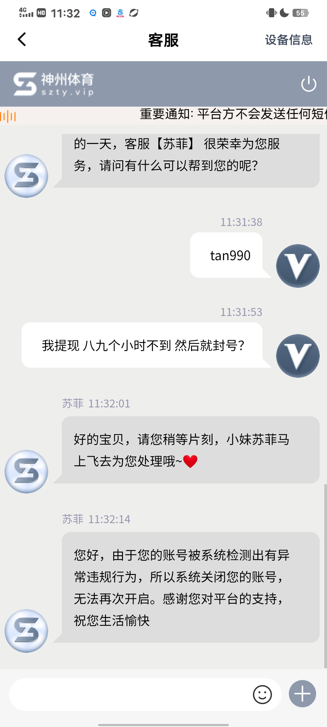 昨晚参与100+100 提现169u 九个小时 还在审核中 然后突然封号了 在旺旺群里 说是我自己的原因啥的  打的真人电子 我一没多账号 二没对打 我就连免费都没买过