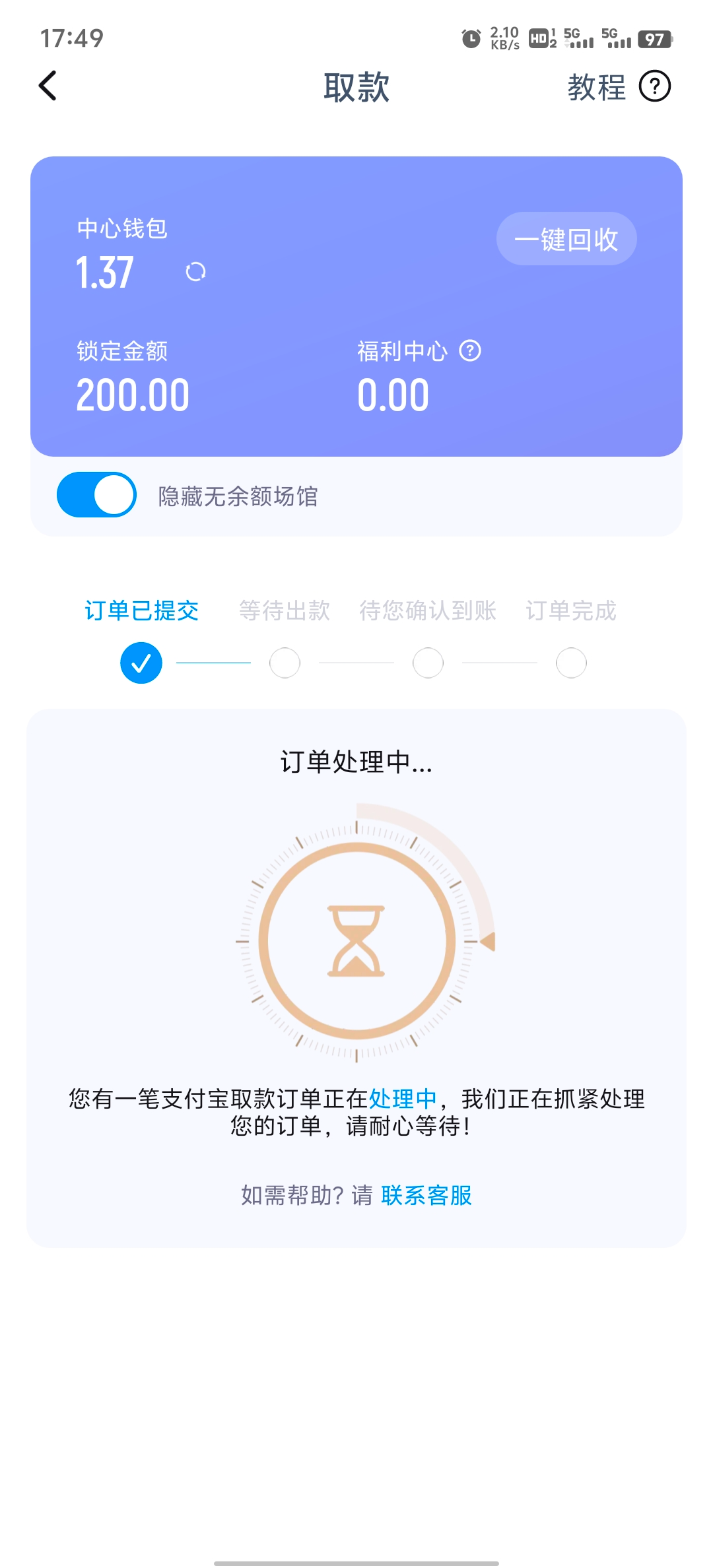 本来打到500的流水够了就掉到200提现了,不知道到不到账