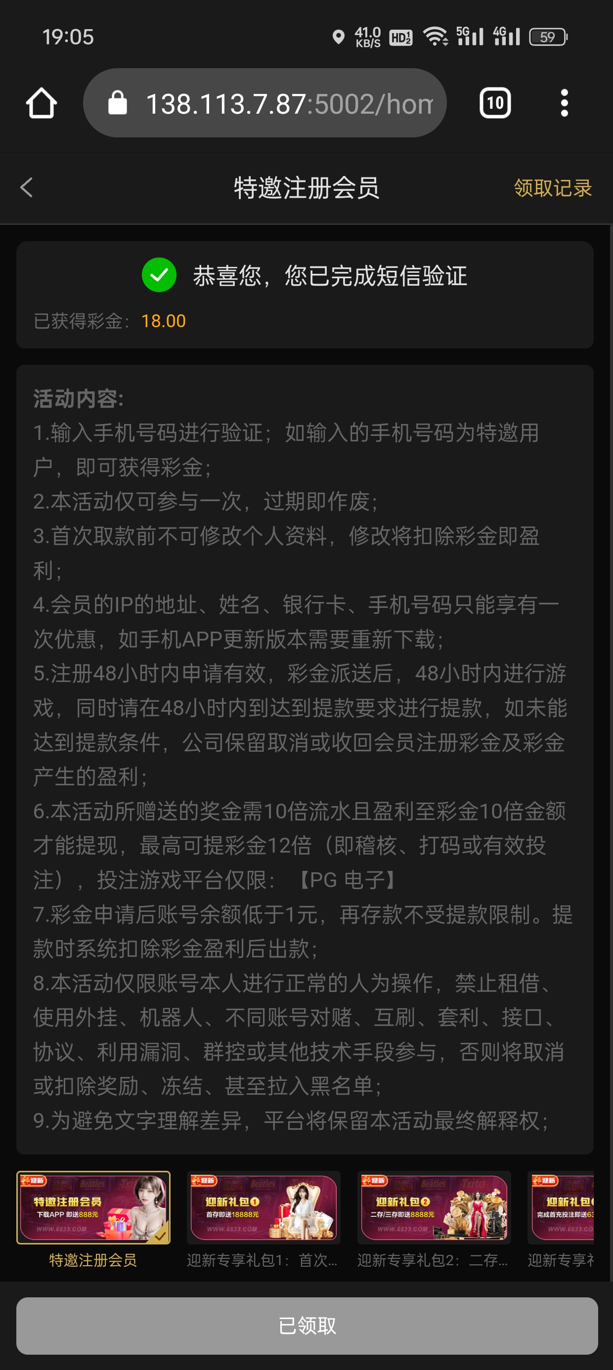收到这个短信的去试试应该可以领取到特邀彩金,亲测领到了18