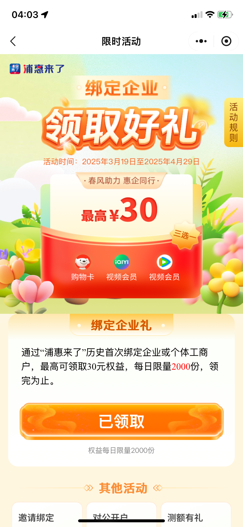 自己去应用商店下载浦惠来了,注册实名,找到活动然后绑定企业就可以领取一个20e卡,可以自己去套现,不知道自己企业码的,去微信搜索电子营业执照查,执照异常吊销注销的都可以