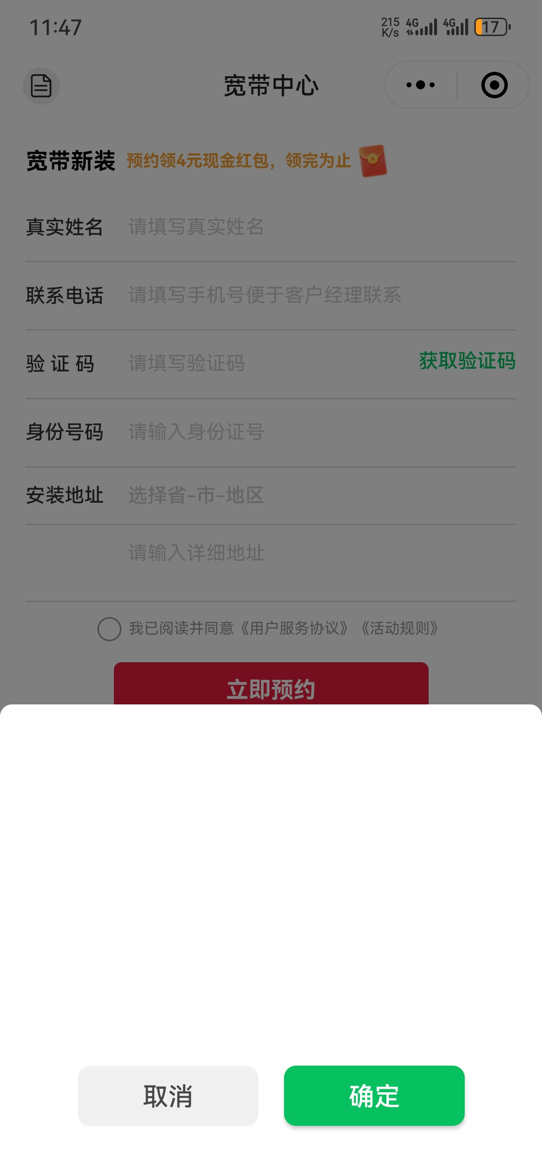 跟支付宝那个红包一样,就是预约一下宽带而已