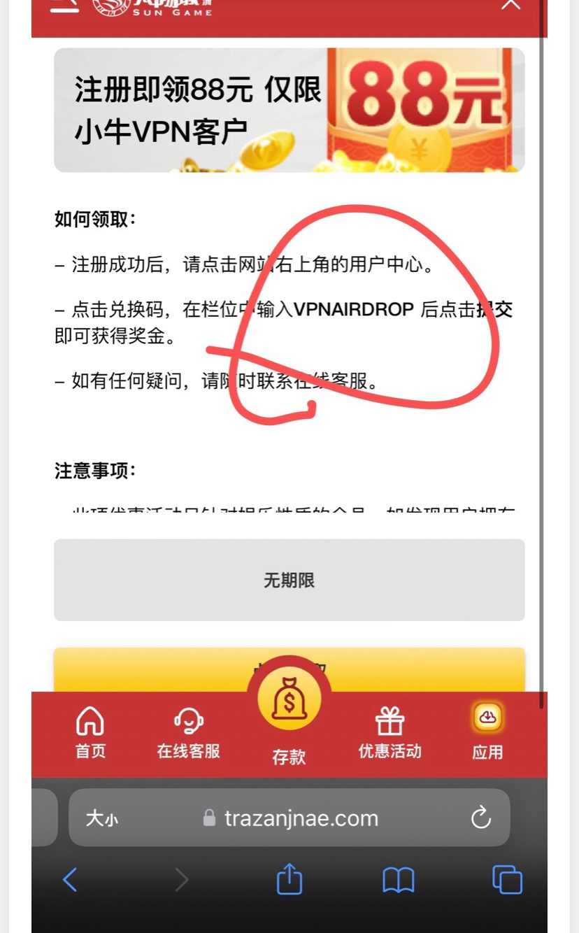 这是vpn加速器的广告,领取88一定的填这个推荐码否则领不到。注册好去优惠活动复制兑换码。然后去兑换就可以了,已经有人出款了。