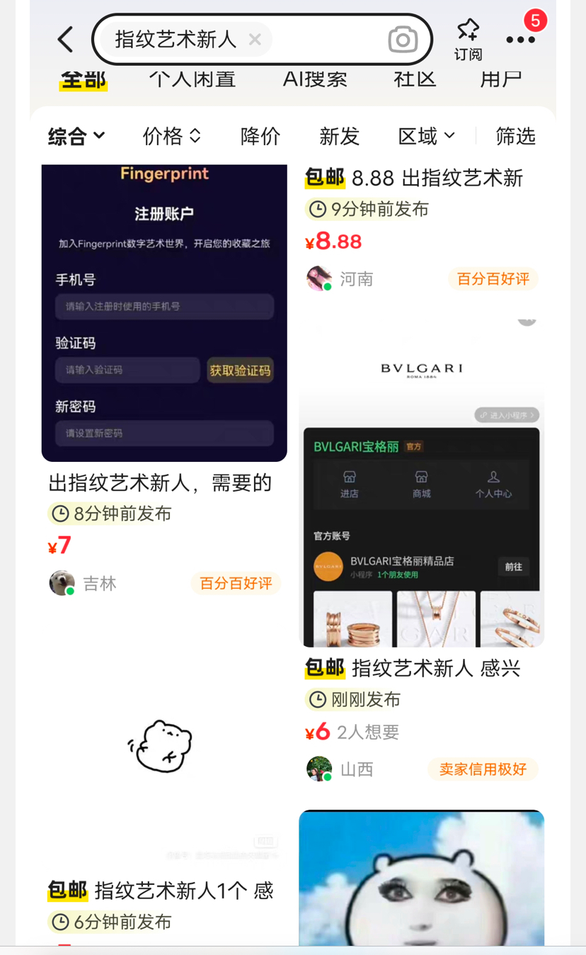 咸鱼搜指纹艺术,挂在主页上基本就是秒卖,
