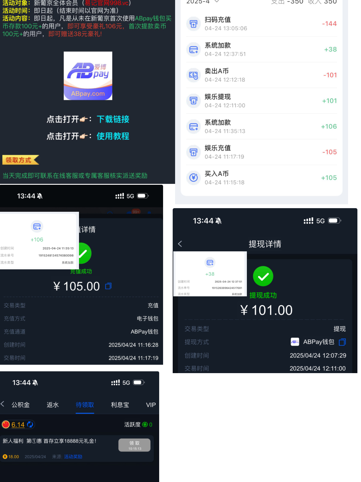 👍活动一按照活动来到老友推荐的网站998.vc 进行注册 注意⚠️在abpay买币的时候 /尽量要大于100/ 可挂零头 我买了105充平台 充值成功后联系998vc在线客服进行申请106活动 /态度一定要强硬/ 并告诉他到账后一并充值进入此平台 要不他不给你处理