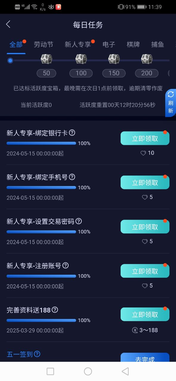完善完成点击右上角刷新就能领取了