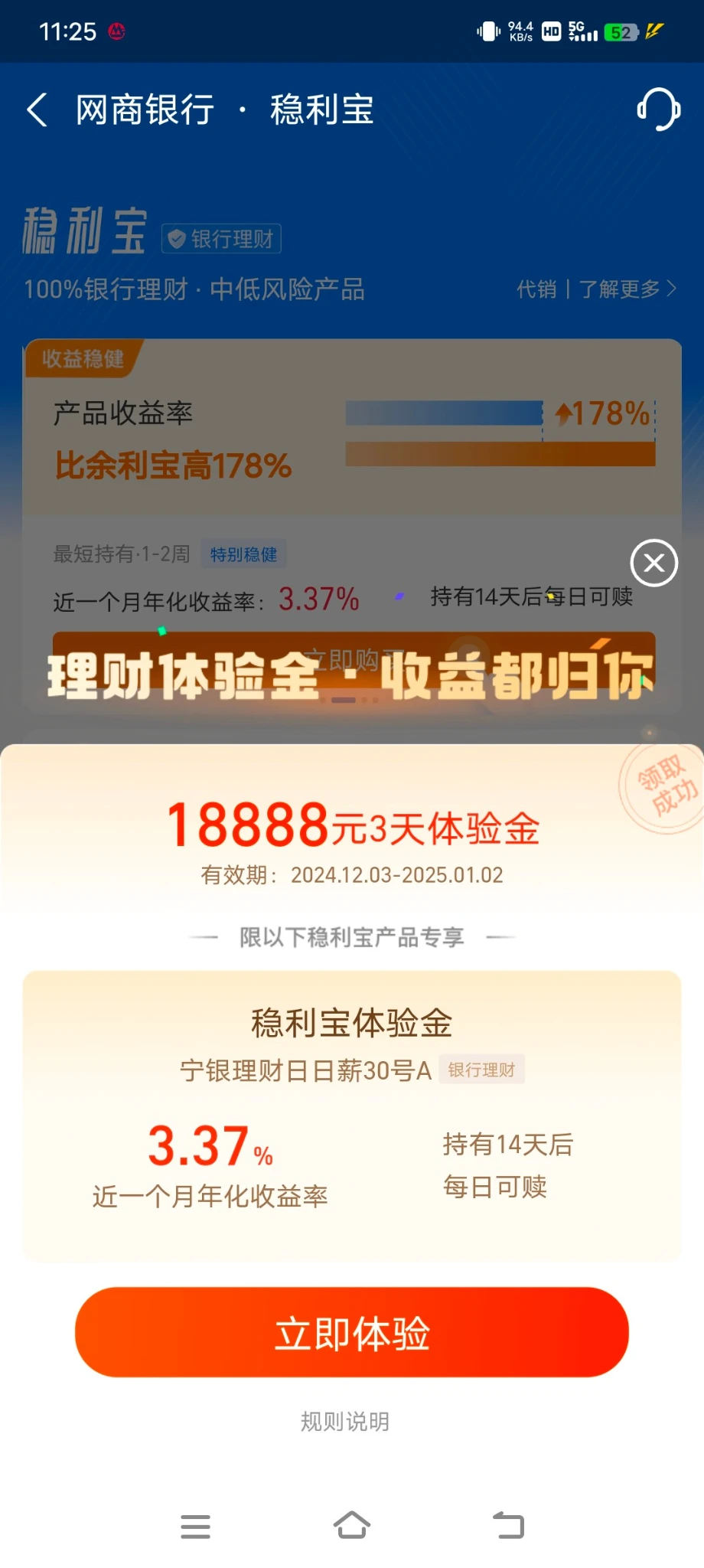 自己去应用商店下载网商银行,登录进去首页找到18888体验金 不知道新用户有没有,我是老用户,进去给了3天18888体验金,一天大概有10块