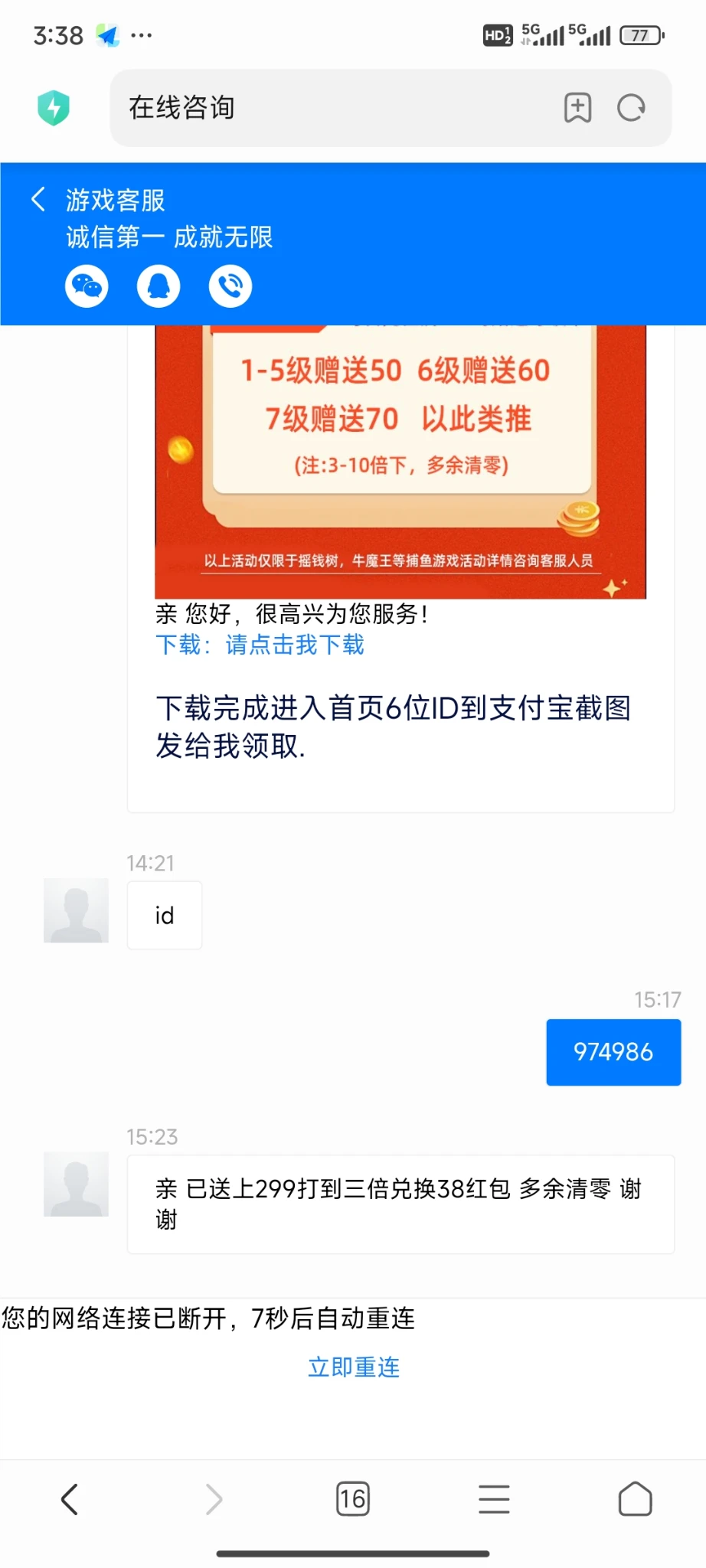 就是加的微信给了个链接我 我去申请直接以为发id 打到三倍兑换38 打到38兑换38 tt10086.top