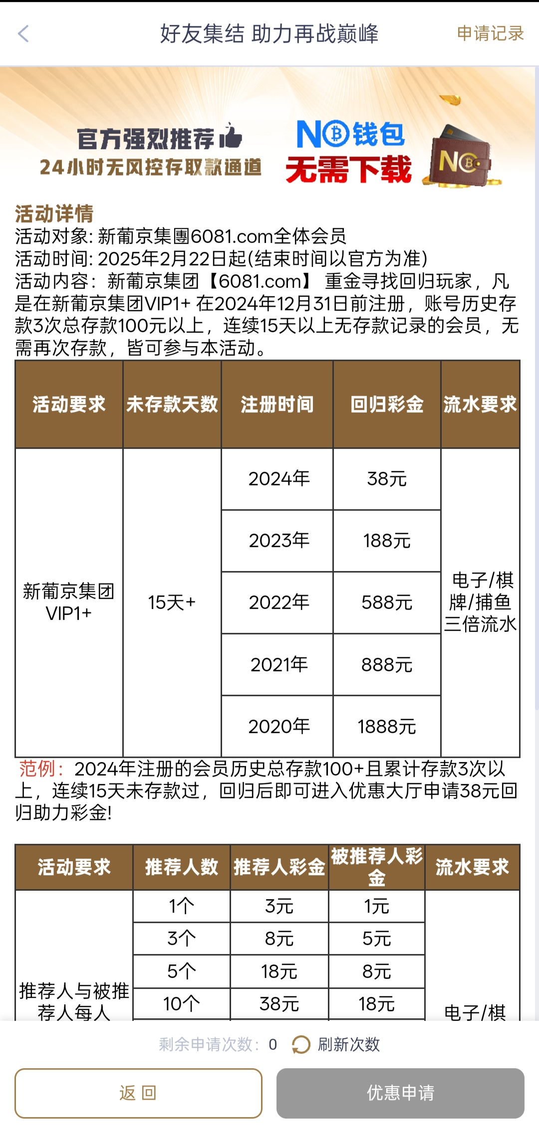 新葡京081 之前玩过的 15天未存过款 第16天去活动迎接王者归来申请回归彩金 网址081.com