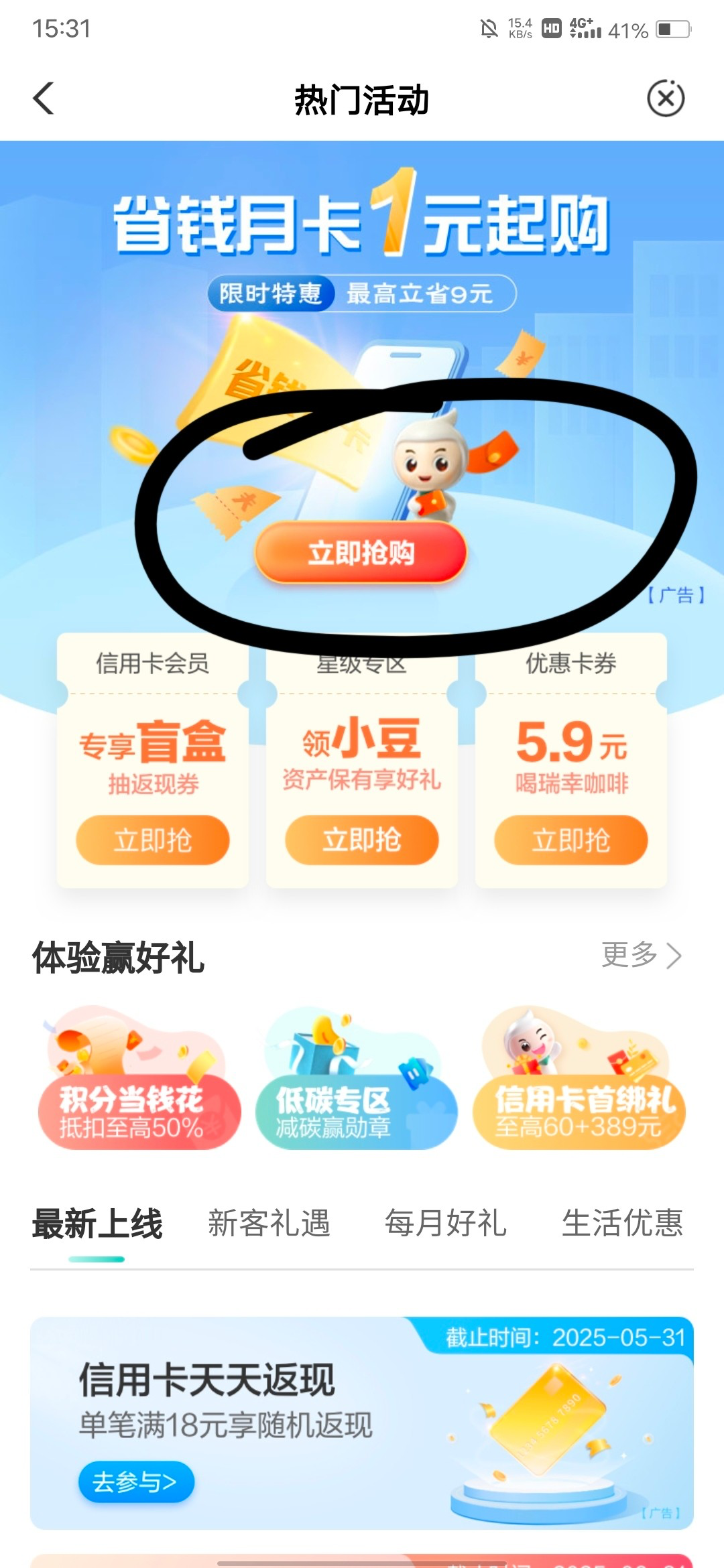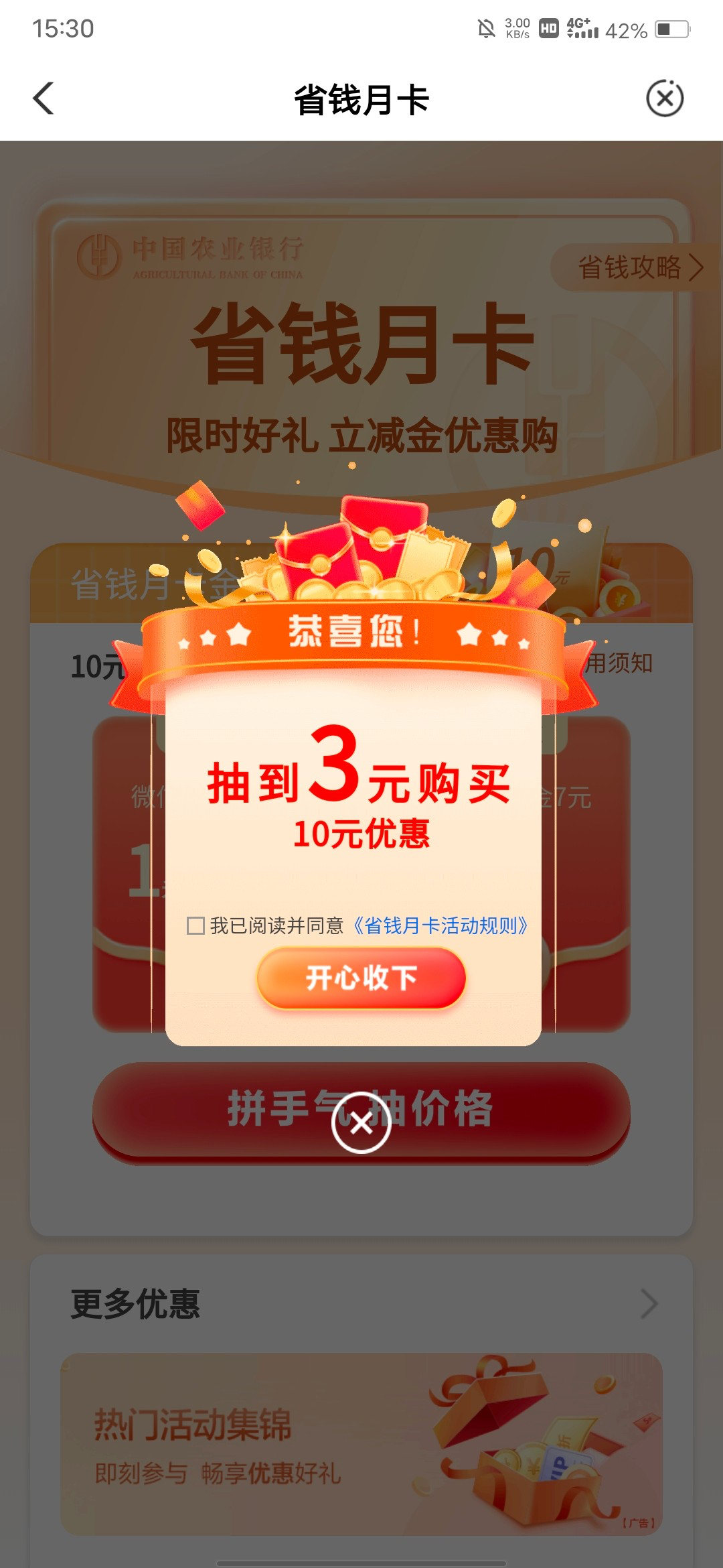 农业银行首页热门活动又可以1块钱买10元立减金了,都是1~3元买10元立减金