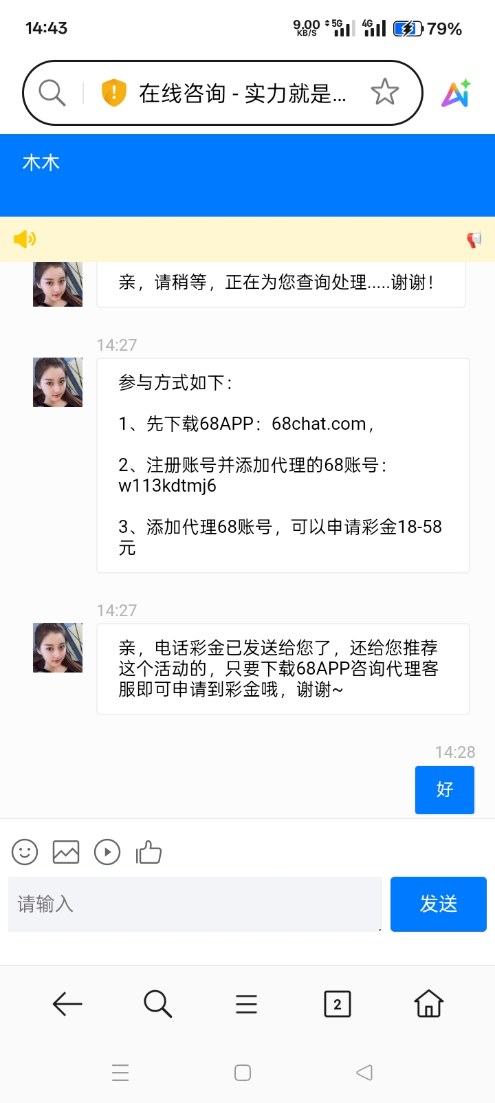 18块 在下载他们68聊天软件加客服 再送18-58不等