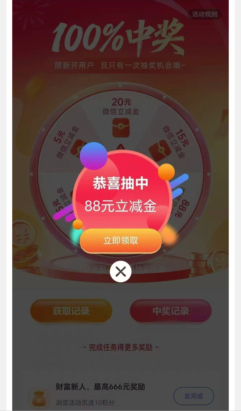 开户直接抽最低5立减+2微信红包,百分百中奖,