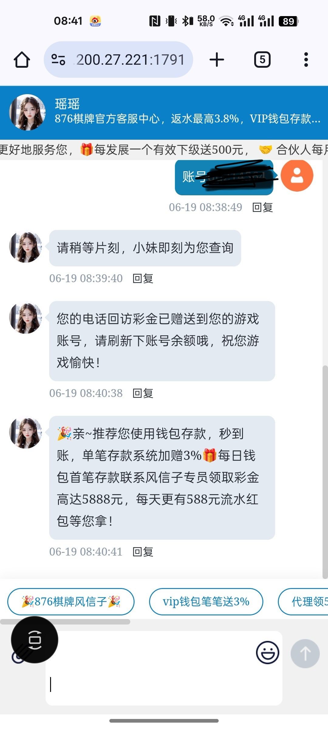 链接 876.cc ,充值过很久没玩的账号去联系客服申请电话彩金,基本都有,这个月我碰到2次58了。