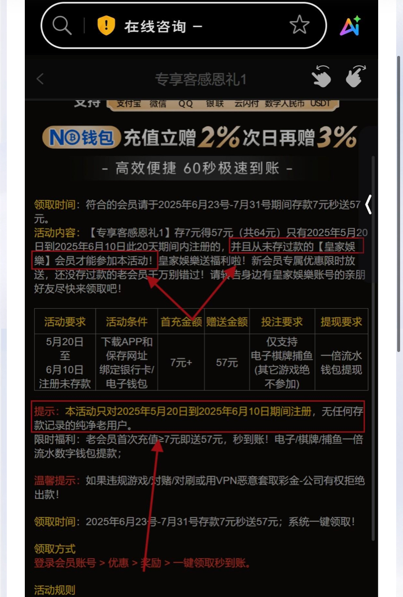皇家娱乐,老玩家5月20日到6月10日没充值过的老玩家,充值7元送57元,我踏马刚好5月21日充过,参加不了,老哥们有在5月20到6月10日没冲过的,可以去撸一波,我也想混个有效贴。网址 904.com